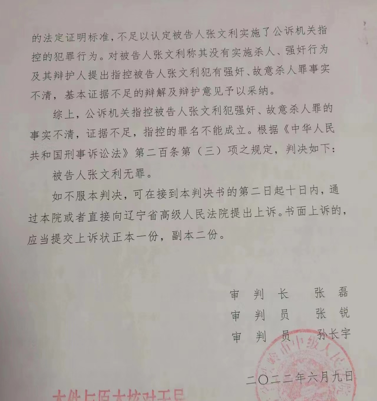 2022年6月9日,铁岭中院对该案作出一审判决,判决被告人张文利无罪。此时,距铁岭市检察院第一次提起公诉已过去26年。