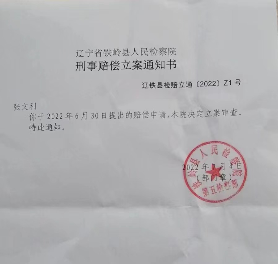 7月4日,铁岭县检察院作出刑事赔偿立案通知书称,决定立案审查张文利提交的国家赔偿申请。