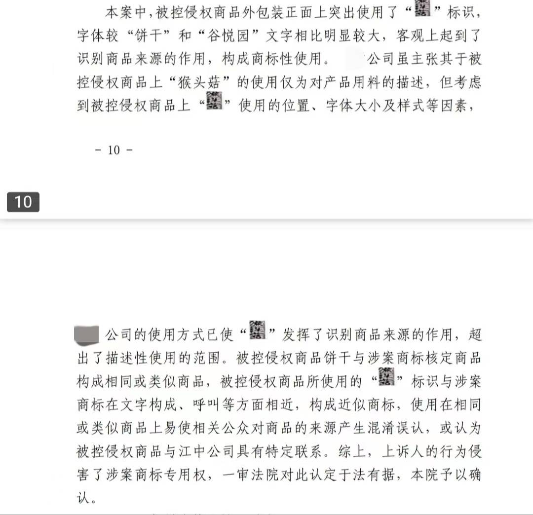 此前,上海一家企业也因生产猴头菇饼干被江中食疗起诉。该公司法人许先生提供的二审判决书显示,2022年3月,北京市知识产权法院认为,考虑被侵权商品上“猴头菇”标识使用的位置、字体大小及样式因素,该企业的使用方式已经使“猴头菇”标识发挥了识别商品来源的作用,超出了描述性使用的范围。
