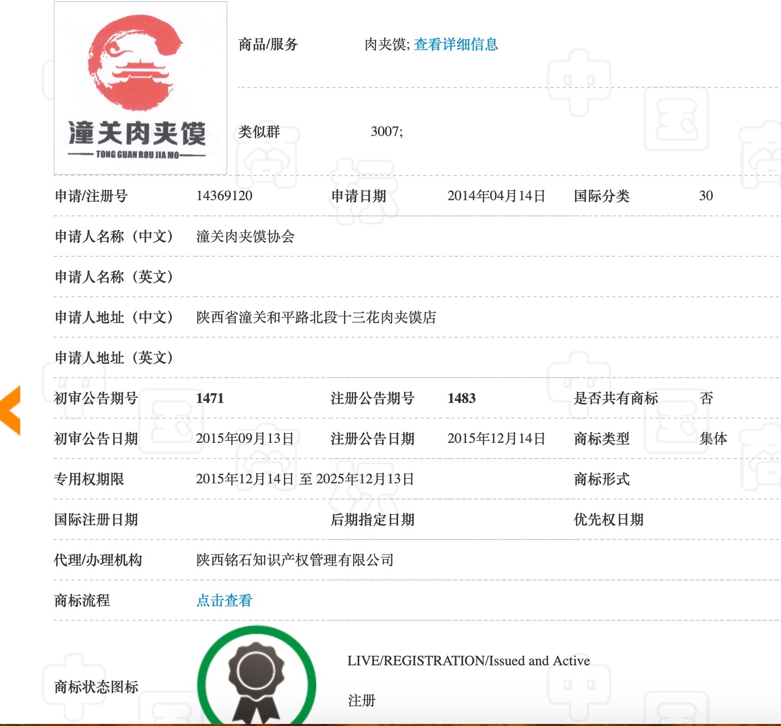 澎湃新闻此前报道,在“潼关肉夹馍”商标事件中,“潼关肉夹馍”地理标志集体商标的注册人为潼关肉夹馍协会,该协会负责人王华锋,将“潼关肉夹馍”商标交由其本人实际控制的两家公司,进行商标加盟运营管理,并收取不菲加盟费。
