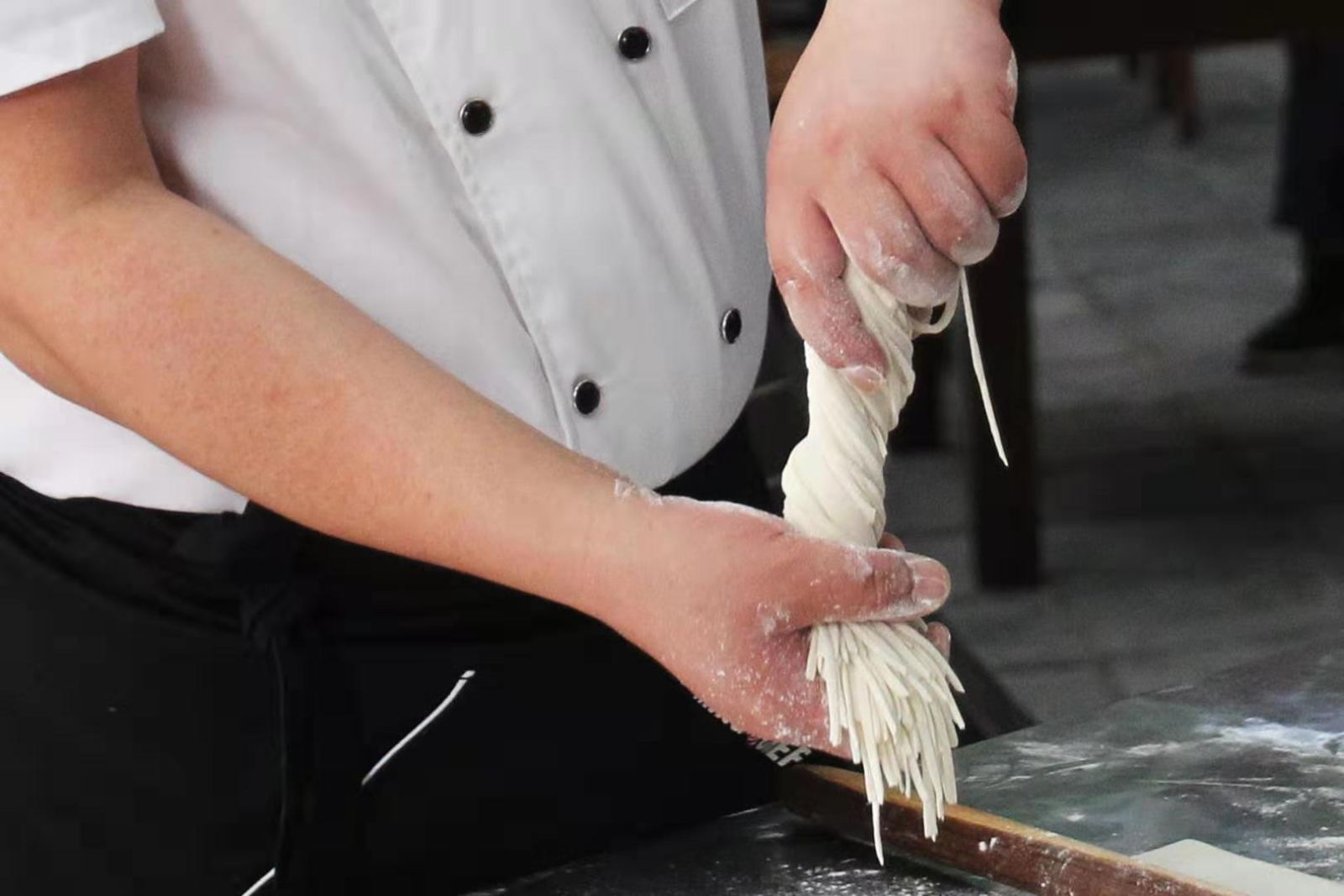 生面和好、揉团,蒙上湿布醒好后擀薄,以特有的“犁面”方法将面切细,沸水出锅有光泽,面劲道滑润。