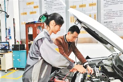 在广东2021年职业院校学生专业技能大赛中,深圳市第二职业技术学校汽修专业女生古慧晶(左)勇夺汽车机电维修赛项目一等奖。(资料图)