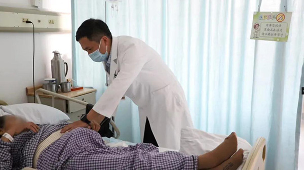 北京大学第一医院副院长王鹏远在病房查看病人康复情况。摄影/冯添