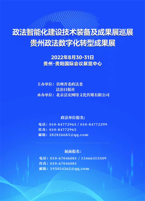 为推进现代信息技术与政法工作深度融合,搭建政法单位、科技企业经验交流、技术对接平台,由贵州省委政法委、法治日报社联合主办,北京法安网络文化传媒有限公司承办的“政法智能化建设技术装备及成果展巡展——贵州政法数字化转型成果展”将于2022年8月30-31日在贵阳国际会议展览中心举办。