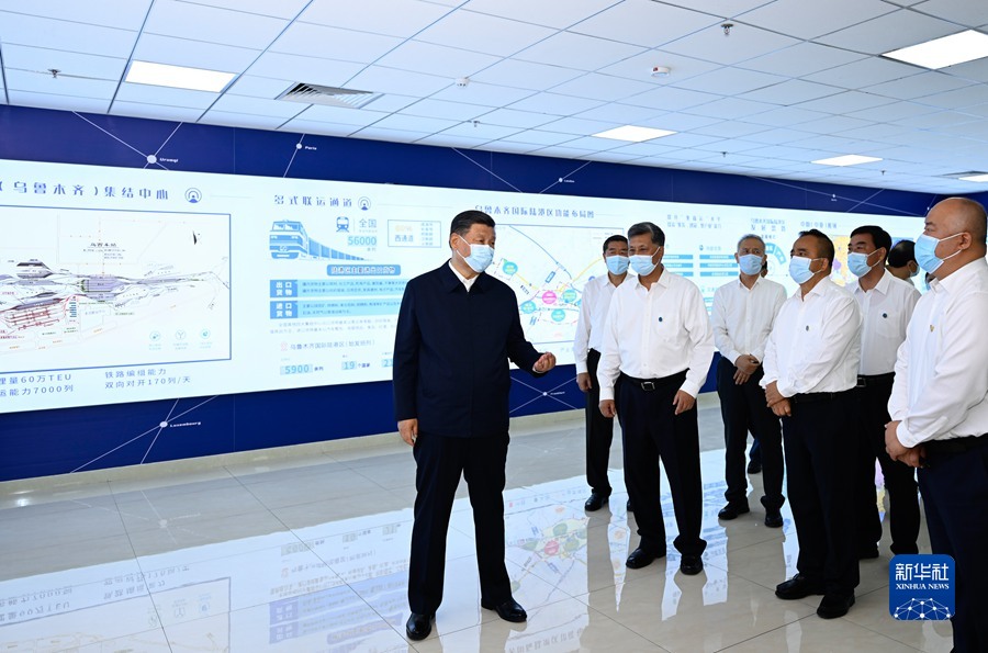 7月12日至15日,中共中央总书记、国家主席、中央军委主席习近平在新疆考察。这是12日下午,习近平在乌鲁木齐国际陆港区考察。新华社记者 李学仁 摄
