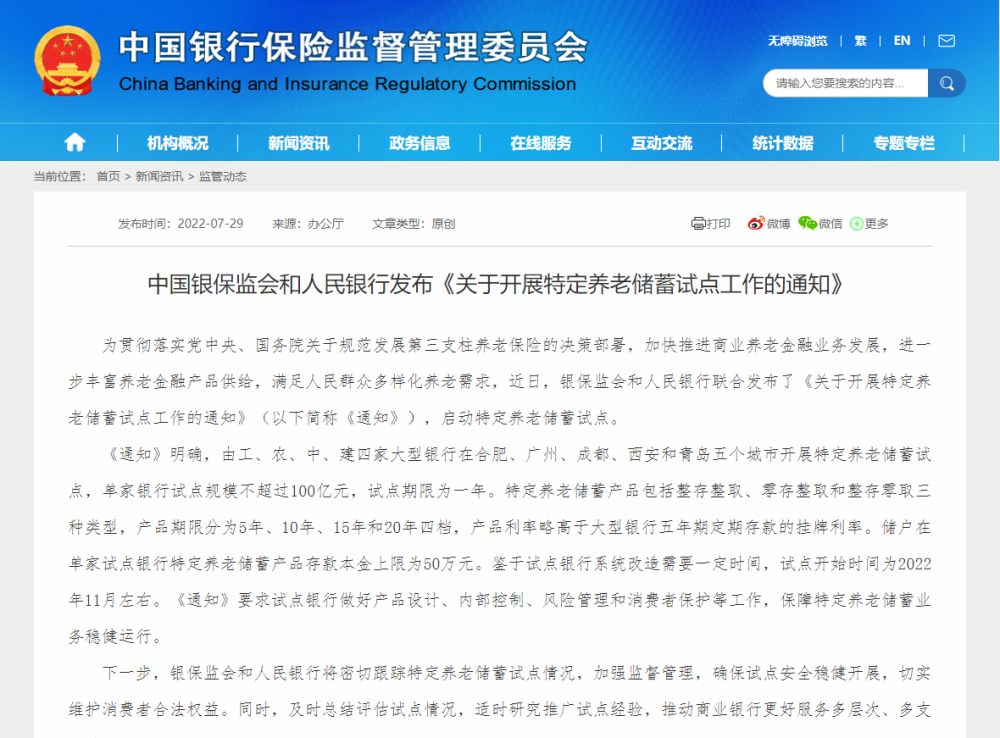 中国银保监会和人民银行发布《关于开展特定养老储蓄试点工作的通知》