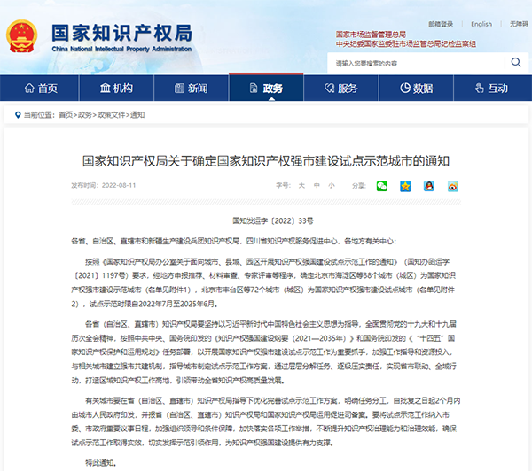 按照《国家知识产权局办公室关于面向城市、县域、园区开展知识产权强国建设试点示范工作的通知》(国知办函运字〔2021〕1197号)要求,经地方申报推荐、材料审查、专家评审等程序,确定北京市海淀区等38个城市(城区)为国家知识产权强市建设示范城市(名单见附件1),北京市丰台区等72个城市(城区)为国家知识产权强市建设试点城市(名单见附件2),试点示范时限自2022年7月至2025年6月。
