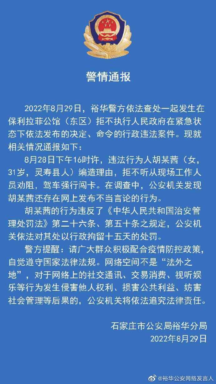 据通报,8月28日下午16时许,违法行为人胡某茜(女,31岁,灵寿县人)编造理由,拒不听从现场工作人员劝阻,驾车强行闯卡。在调查中,公安机关发现胡某茜还存在网上发布不当言论的行为。
