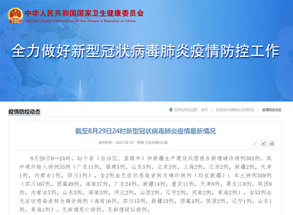 8月29日0—24时,31个省(自治区、直辖市)和新疆生产建设兵团报告新增确诊病例382例。其中境外输入病例33例(广东11例,福建5例,山东5例,北京3例,上海2例,江苏2例,新疆2例,天津1例,内蒙古1例,四川1例),含2例由无症状感染者转为确诊病例(均在新疆);本土病例349例(四川167例,西藏49例,海南37例,广东24例,新疆14例,重庆11例,天津8例,黑龙江8例,陕西8例,内蒙古7例,山东3例,湖南3例,河北2例,山西2例,辽宁2例,河南2例,青海2例),含53例由无症状感染者转为确诊病例(海南16例,四川15例,新疆13例,西藏4例,陕西2例,辽宁1例,山东1例,青海1例)。无新增死亡病例。无新增疑似病例。