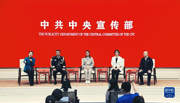 2021年7月22日,中宣部举行“传递榜样力量 争取新的光荣”中外记者见面会。四位“两优一先”代表在会上分享了他们爱党为民、担当奉献的感人故事。新华社记者 潘旭 摄