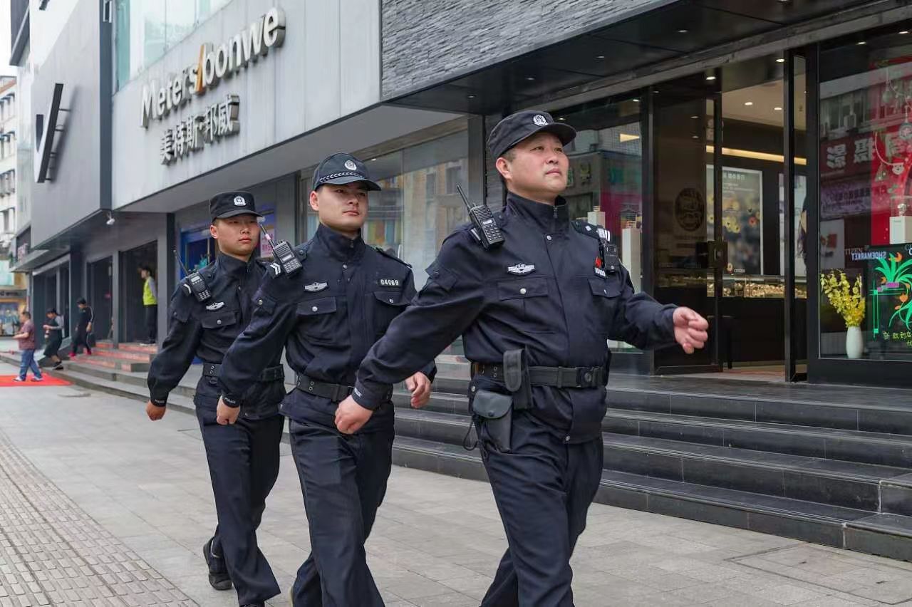 图为王军(右一)带领队员在安徽合肥步行街街面巡逻。 受访者供图