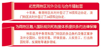 一是授权特区缔结双边协定。从国际法角度看,港澳特区作为中国的一部分,不具有国际法主体资格和对外缔约权。考虑到两特区的实际需要,中央政府通过基本法赋予特区一定的缔约权,即港澳特区可以“中国香港”“中国澳门”名义在经济、贸易、金融等适当领域对外签订和履行协议。此外,经中央政府授权,港澳特区还可对外谈判和签订互免签证协定、民航协定、司法协助类协定、投资保护协定等。这些授权性安排切实体现了维护中央全面管治权和保障特区高度自治权的有机统一。十年来,香港特区共对外签订了76项双边协定,澳门特区共对外签订了24项双边协定,拓宽了两特区对外交往与合作的辐射面。