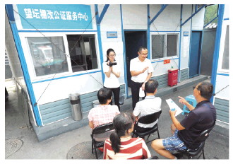 2017年7月31日,北京核心城区最大棚改项目——望坛棚改项目工地,公证服务中心工作人员现场为业主办理公证。 本报记者 王建军 摄