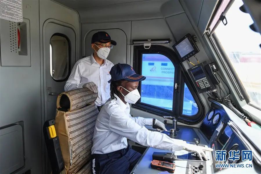 2021年3月22日,在肯尼亚首都内罗毕,蒙内铁路指导司机杨明和他的肯尼亚女徒弟康西莉亚在机车内进行发车前的检查工作。新华社记者 李琰 摄