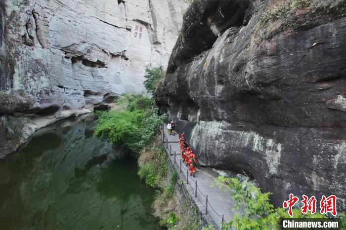 中新网三明10月8日电 (吴皓)近日,在位于三明市永安市的桃源洞风景名胜区内,出现了一群头顶“钢盔”,手持装备,全副武装的“橙色战士”,他们迈着矫健的步伐,穿梭于景区的各个角落,在桃源洞的秀丽风光中,默默守护着来往游客,他们就是三明市森林消防支队的指战员们。