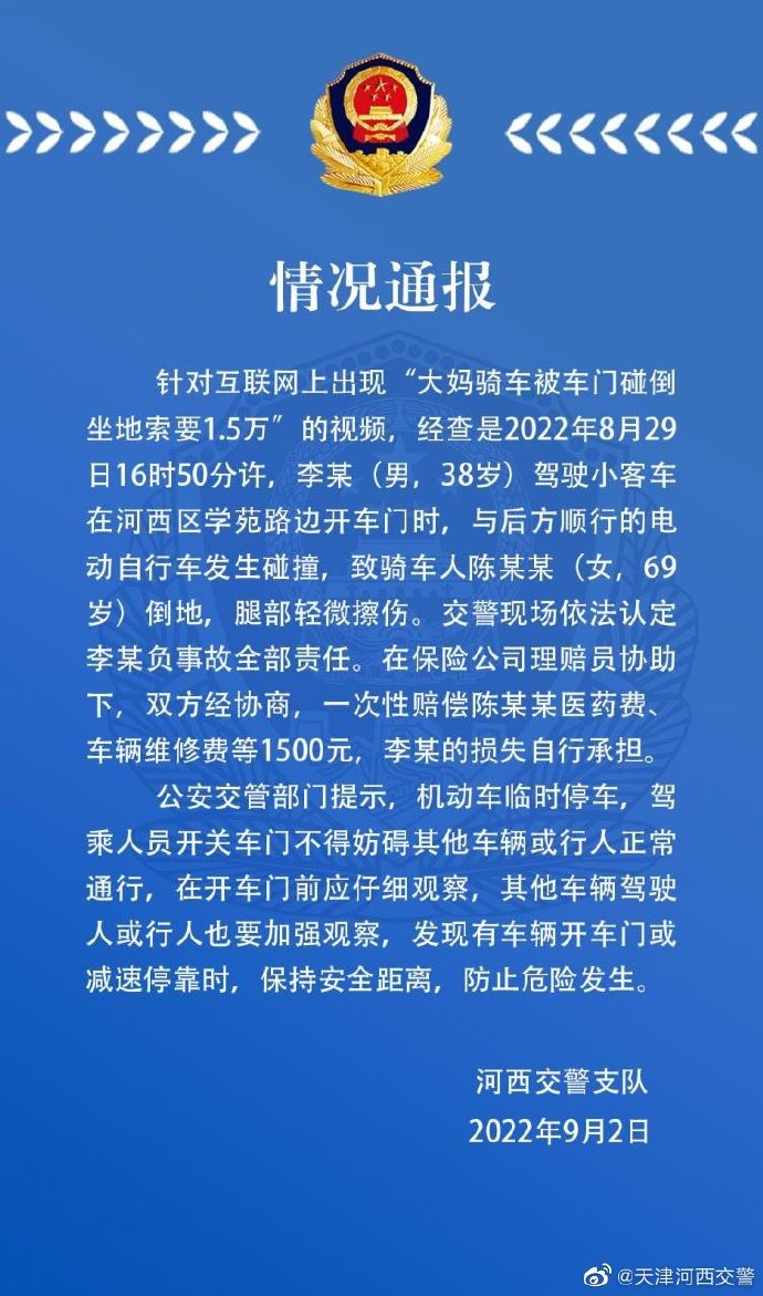 中新网9月2日电天津市公安交通管理局河西支队2日在其官方微博发布通报称,针对互联网上出现“大妈骑车被车门碰倒坐地索要1.5万”的视频,经查是8月29日16时50分许,李某(男,38岁)驾驶小客车在河西区学苑路边开车门时,与后方顺行的电动自行车发生碰撞,致骑车人陈某某(女,69岁)倒地,腿部轻微擦伤。交警现场依法认定李某负事故全部责任。在保险公司理赔员协助下,双方经协商,一次性赔偿陈某某医药费车辆维修费等1500元,李某的损失自行承担。