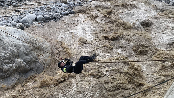 四川省甘孜藏族自治州泸定县发生6.8级地震后,州公安局特警队员徒手爬绳索渡河,打通生命救援通道。