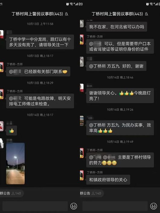 10月14日,网名为“飞翔”的网友在丁桥村警民议事厅群聊内说道:丁桥所为民办实事,效率高。群内群众纷纷点赞。