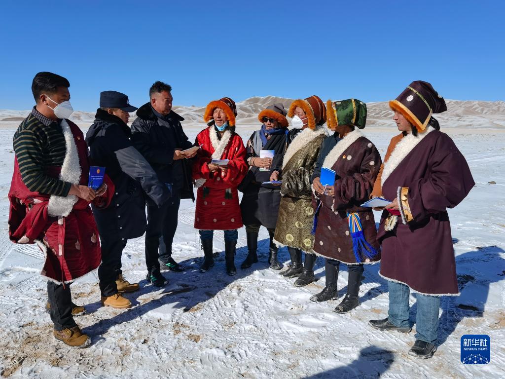 2021年12月20日,玛多县人民法院院长钱快乾(左一)给当地牧区群众宣讲法律知识。新华社发