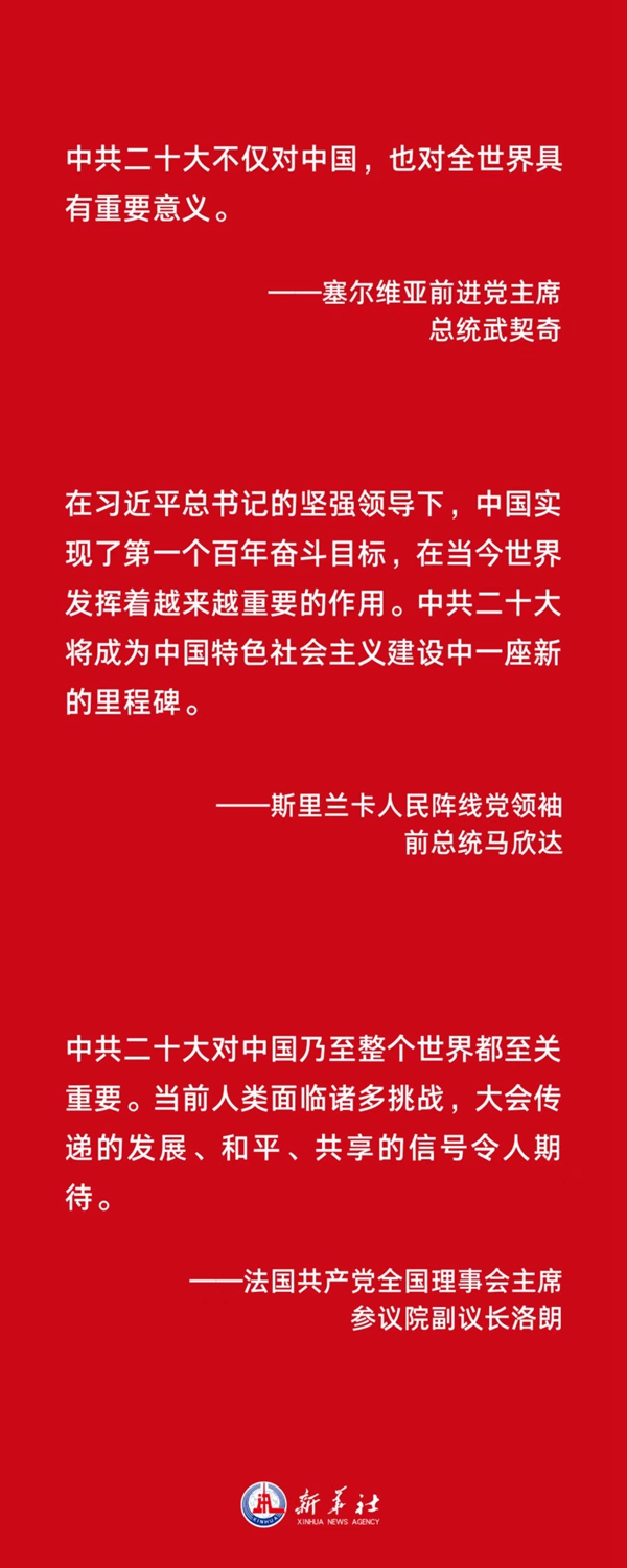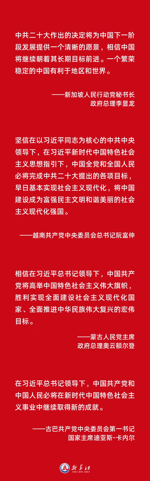 中共二十大回顾总结了过去五年的工作和新时代十年的伟大变革,描绘了以中国式现代化全面推进中华民族伟大复兴的宏伟蓝图。各国政党政要通过贺电贺函表达他们对中国的未来充满信心,坚信中共必将团结带领中国人民不断谱写新时代中国特色社会主义新篇章。