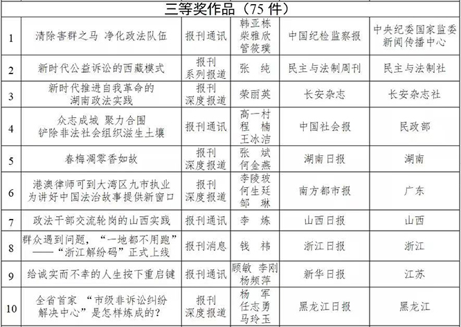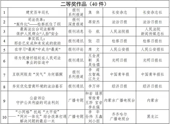 2021年度全国政法优秀新闻作品评选结果近日揭晓,共评选出138件优秀新闻作品。其中,一等奖23件,二等奖40件,三等奖75件。