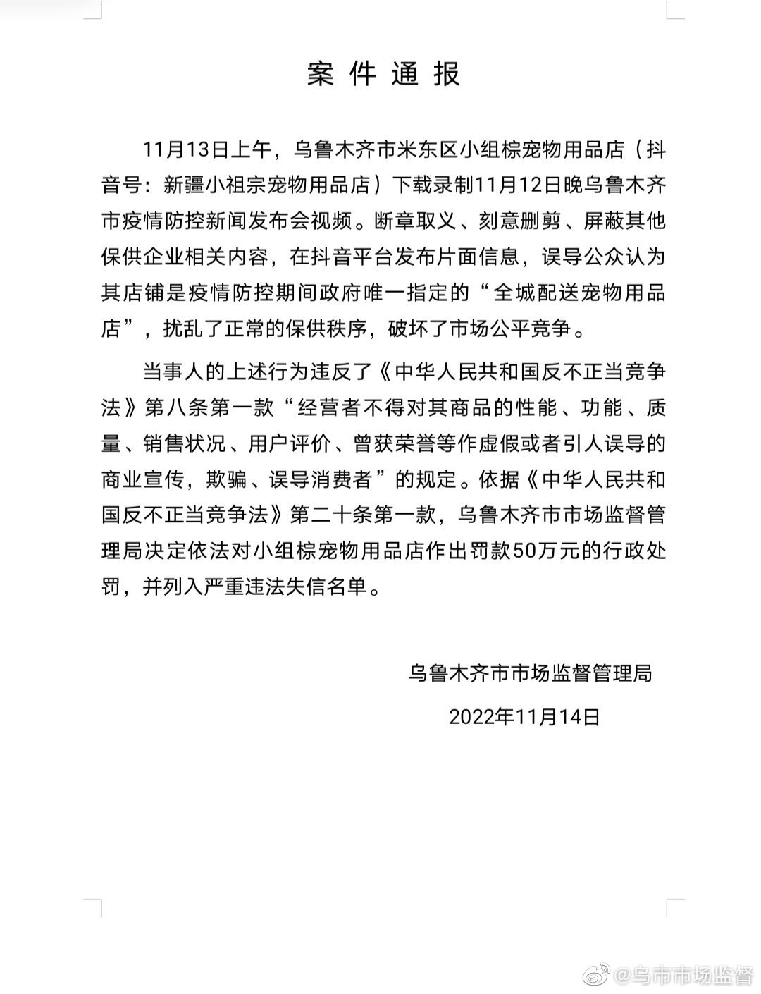 中新网11月14日电据乌鲁木齐市市场监督管理局官方微博消息,乌鲁木齐市市场监督管理局14日发布案件通报称,11月13日上午,乌鲁木齐市米东区小组棕宠物用品店(抖音号:新疆小祖宗宠物用品店)下载录制11月12日晚乌鲁木齐市疫情防控新闻发布会视频。断章取义、刻意删剪、屏蔽其他保供企业相关内容,在抖音平台发布片面信息,误导公众认为其店铺是疫情防控期间政府唯一指定的“全城配送宠物用品店”,扰乱了正常的保供秩序,破坏了市场公平竞争。