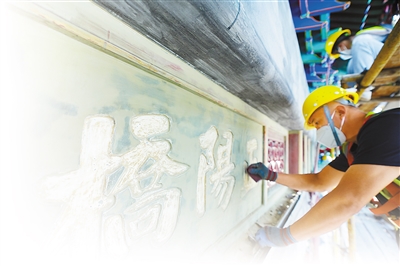 北京城建工人在对中轴线上的“正阳桥”牌匾进行打磨,准备重新贴金。本报记者 贺 勇摄