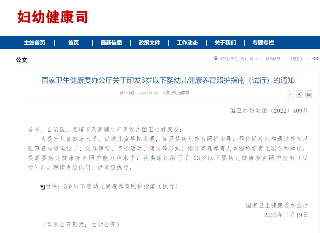 新华社北京11月29日电 为提升儿童健康水平,促进儿童早期发展,加强婴幼儿养育照护指导,国家卫生健康委办公厅近日印发《3岁以下婴幼儿健康养育照护指南(试行)》。