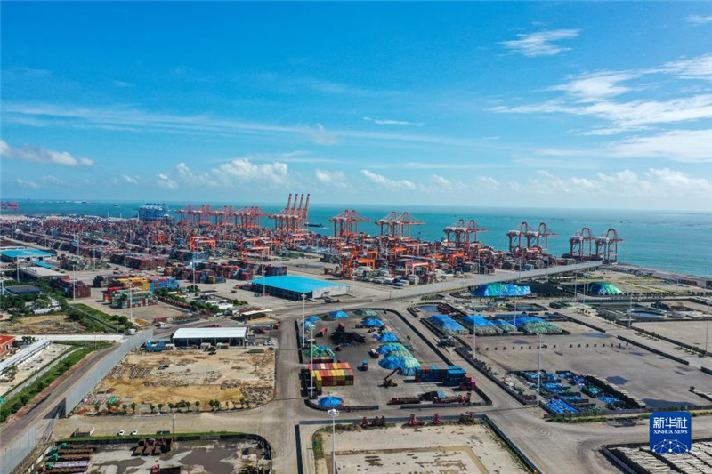 这是2022年8月27日拍摄的位于平陆运河出海口附近的北部湾港钦州港区大榄坪作业区(无人机照片)。新华社记者 曹祎铭 摄