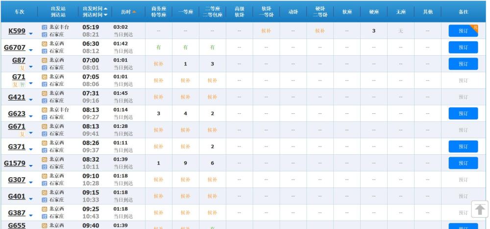 12月30日北京-石家庄部分余票情况截图。来源:12306网站