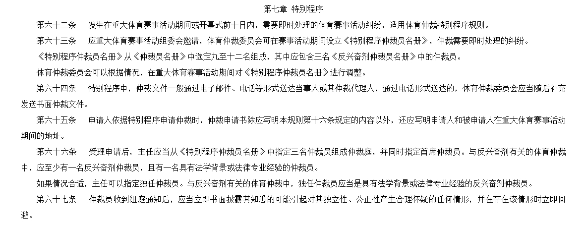 此外,发生在重大体育赛事活动期间或开幕式前十日内,需要即时处理的体育赛事活动纠纷,适用体育仲裁特别程序规则。