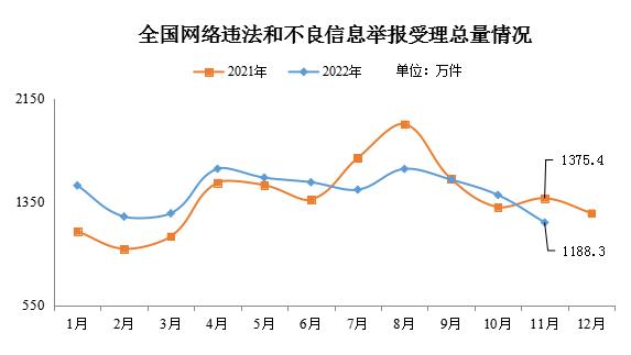 中新网1月3日电 据中央网信办举报中心官方微信公众号消息,2022年11月,中央网信办举报中心指导全国各级网信举报工作部门、主要网站平台受理举报1188.3万件,环比下降15.1%、同比下降13.6%。其中,中央网信办举报中心受理举报49.4万件,环比下降3.0%、同比增长57.9%;各地网信举报工作部门受理举报77.7万件,环比下降4.6%、同比下降25.9%;全国主要网站平台受理举报1061.2万件,环比下降16.3%、同比下降14.4%。