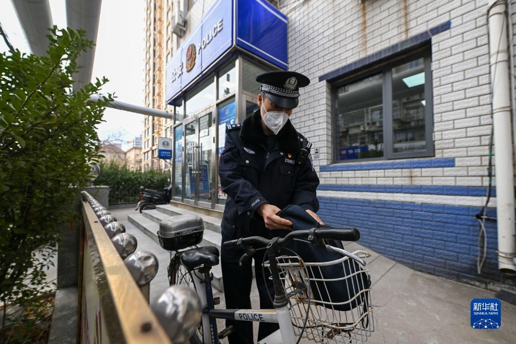1月7日,在宁园街派出所,陈炳云准备骑自行车前往社区。