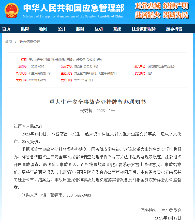 2023年1月8日,你省南昌市发生一起大货车冲撞人群的重大道路交通事故,造成19人死亡、20人受伤。