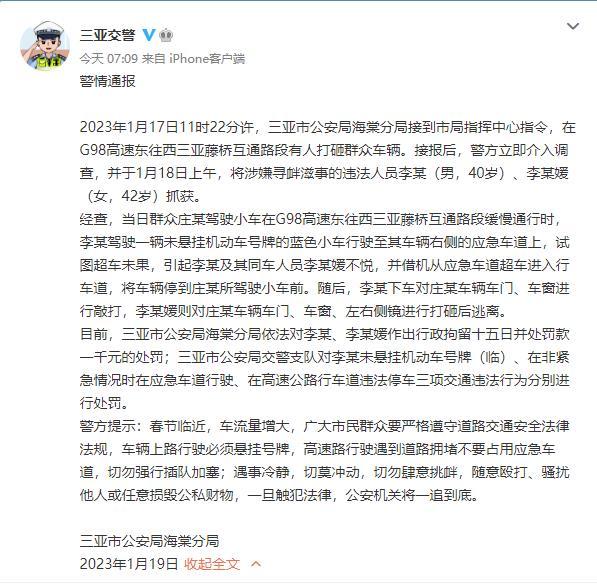 中新网1月19日电 海南省三亚市公安局交通警察支队官方微博19日发布警情通报称,2023年1月17日11时22分许,三亚市公安局海棠分局接到市局指挥中心指令,在G98高速东往西三亚藤桥互通路段有人打砸群众车辆。接报后,警方立即介入调查,并于1月18日上午,将涉嫌寻衅滋事的违法人员李某(男,40岁)、李某媛(女,42岁)抓获。