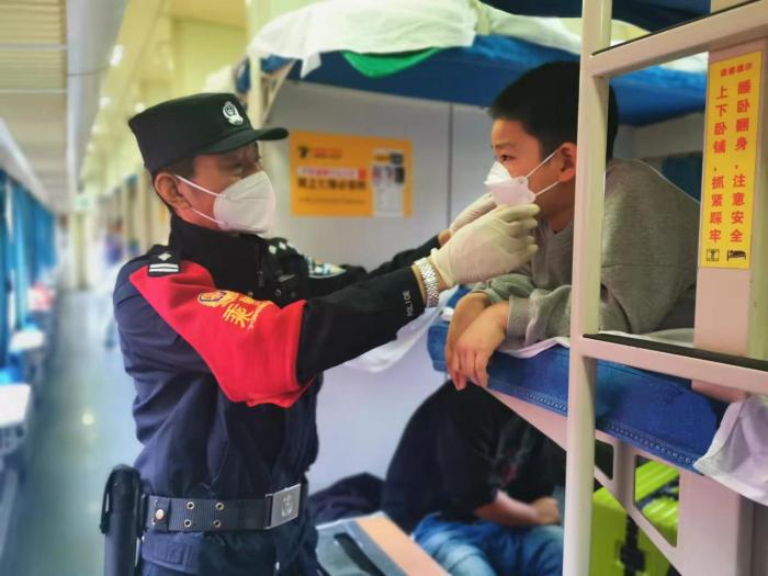 巡视途中,郝师傅帮助一名小旅客带好口罩(图:李鸿飞)