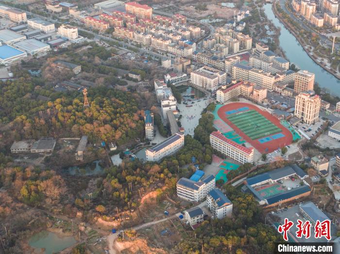 1月31日,航拍金鸡山,右边操场区域即为致远中学(高中部),学校西边和南边都是茂密的树林。 刘力鑫 摄