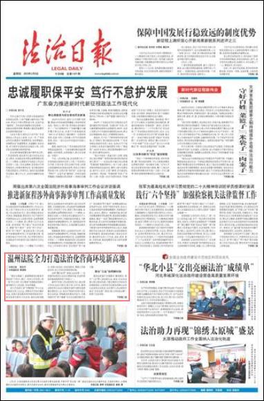 温州市中级人民法院党组书记、院长蒋卫宇向《法治日报》记者介绍,近年来,温州法院把优化法治化营商环境作为服务高质量发展的切入点,依法平等保护各类市场主体合法权益,持续激发民营经济活力,为温州新时代“两个健康”先行区创建贡献司法力量。