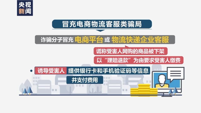 冒充电商物流客服类骗局中,诈骗分子冒充电商平台或物流快递企业客服,谎称受害人网购的商品被下架,以“理赔退款”为由要求缴费,诱导受害人提供银行卡和手机验证码等信息,并诱导受害人支付费用。