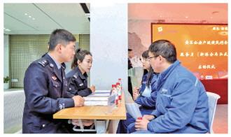 图为湖北省黄石市公安局民警向企业员工介绍“放管服”改革措施。