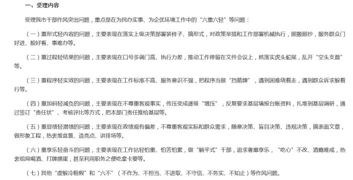 宣城此次受理的干部作风突出问题,重点是在为民办实事、为企优环境工作中的“六重六轻”等问题:重形式轻内容的问题,重过程轻结果的问题,重程序轻实效的问题,重加码轻减负的问题,重显绩轻潜绩的问题,重享乐轻奋斗的问题。