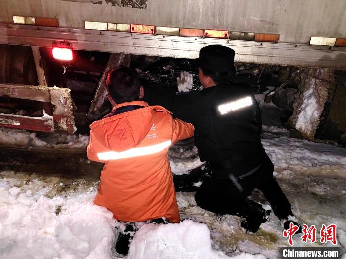 图为民警与公路养护人员安装货车车轮防滑链。 西藏林芝边境管理支队供图