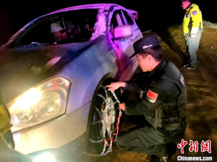 图为民警帮助游客安装车轮防滑链。 西藏林芝边境管理支队供图