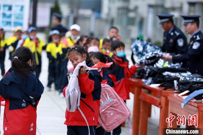 移民管理警察为学生发放书包,鼓励学生好好学习,将来成为栋梁之材。 肖富贵 摄