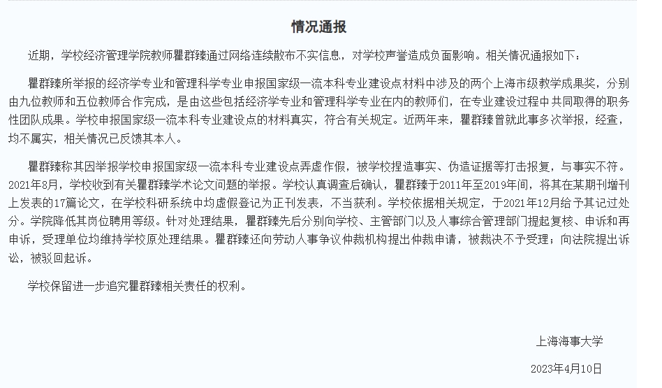 中新网4月10日电 据上海海事大学官网消息,4月10日,上海海事大学发布情况通报表示,近期,学校经济管理学院教师瞿群臻通过网络连续散布不实信息,对学校声誉造成负面影响。通报如下: