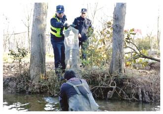 图为生态警长巡河时处理河道地笼。崇明横沙派出所供图