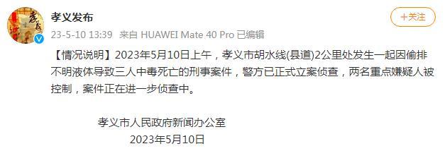 中新网5月10日电 据“孝义发布”官微消息,山西省孝义市人民政府新闻办公室10日发布情况说明称,2023年5月10日上午,孝义市胡水线(县道)2公里处发生一起因偷排不明液体导致三人中毒死亡的刑事案件,警方已正式立案侦查,两名重点嫌疑人被控制,案件正在进一步侦查中。