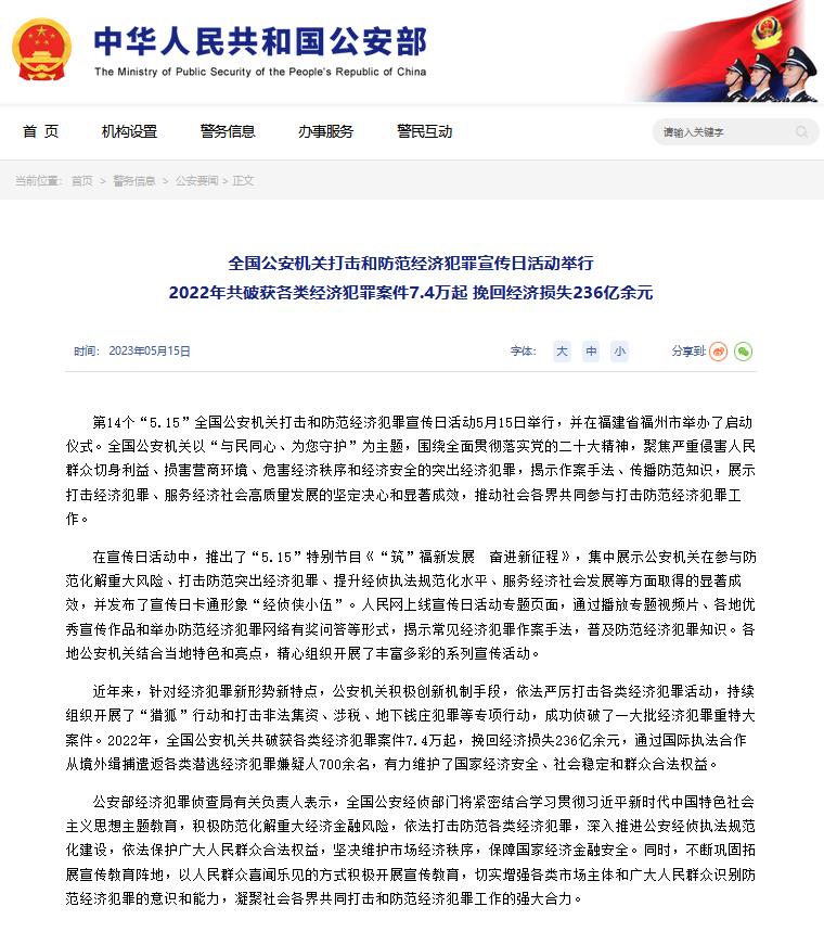 近年来,针对经济犯罪新形势新特点,公安机关积极创新机制手段,依法严厉打击各类经济犯罪活动,持续组织开展了“猎狐”行动和打击非法集资、涉税、地下钱庄犯罪等专项行动,成功侦破了一大批经济犯罪重特大案件。2022年,全国公安机关共破获各类经济犯罪案件7.4万起,挽回经济损失236亿余元,通过国际执法合作从境外缉捕遣返各类潜逃经济犯罪嫌疑人700余名,有力维护了国家经济安全、社会稳定和群众合法权益。