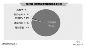 2022年,360安全大脑共截获移动端新增恶意程序样本约2407.9万个,同比上升155.3%,平均每天截获新增手机恶意程序样本约6.6万个。从第三季度开始,新增样本量逐步增加,11月达到峰值。移动端新增恶意程序类型主要为资费消耗,占97.2%;其次为隐私窃取、违法违规、流氓行为、欺诈软件,分别占1.4%、1.1%、0.1%、0.1%。