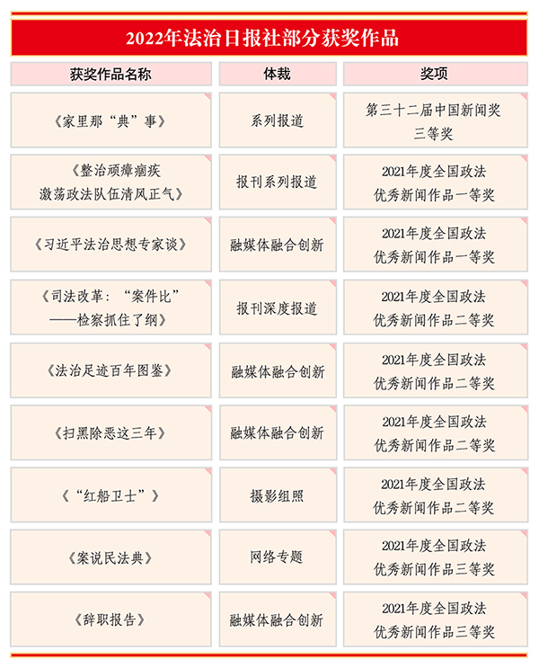 2022年,报社1件作品获得第三十二届中国新闻奖三等奖,8件作品分获2021年度全国政法优秀新闻作品一、二、三等奖。报社出品的电影《红纸鹤》入围第十届新西兰亚太国际电影节提名。